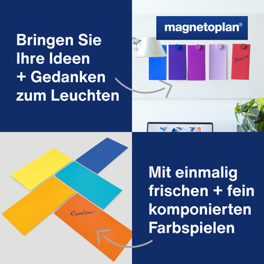 Bringen Sie Ihre Ideen + Gedanken zum Leuchten mit einmalig frischen und fein komponierten Farbspielen. Die farbstarken magnetoplan Kommunikationskarten verleihen Ihren Ideen und Gedanken einen einzigartigen, erfrischenden und unvergesslichen Rahmen, der das Wesentliche stets im Blick behält. Besteht aus den Moderationskarten Sea, Dawn, Rainbow. Färbung aus 100 % pflanzlichen Farben.